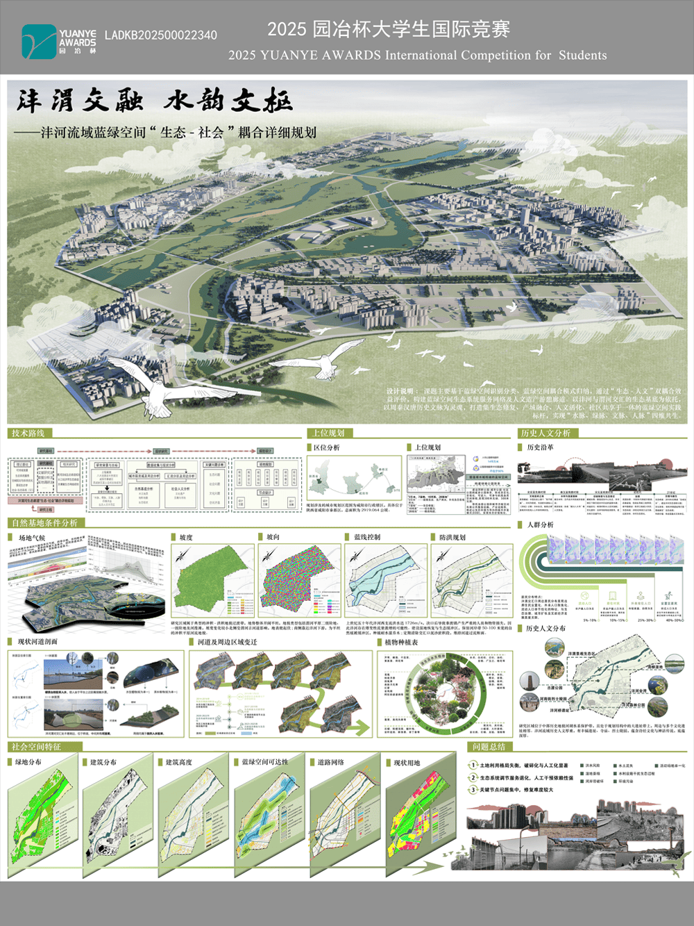 设计说明 : 课题主要基于蓝绿空间识别分类、蓝绿空间耦合模式归纳,通过“生态-人文”双耦合效益评价,构建蓝绿空间生态系统服务网络及人文造产游憩廊道。以沣河与渭河交汇的生态基底为依托,以周秦汉唐历史文脉为灵 ...