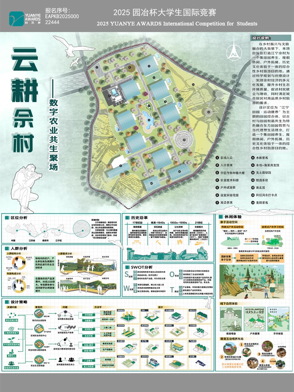 作品简介 在乡村振兴与文旅融合的大背景下,本项目旨在打造江宁佘村为一个集田园养生、度假休闲、户外拓展、历史文化体验于一体的综合性乡村旅游目的地。通过科学规划与创意设计,实现佘 ...